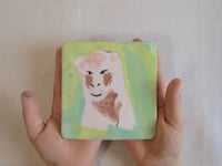 It is a white ceramic tile modeled and painted by hand. It measures 10x10cm.